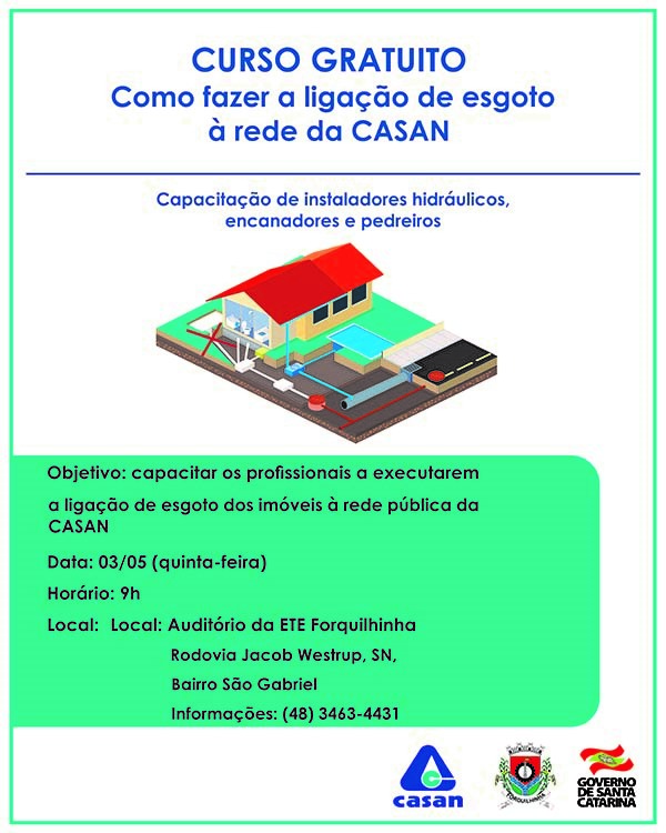 Permanece com inscrições abertas o curso gratuiro "Como fazer a ligação de esgoto à rede da CASAN", que será oferecido no dia 3 de maio, próxima quinta-feira, em Forquilhinha. A capacitação é direcionada a instaladores hidráulicos, encanadores e pedreiros, entre outros profissionais da área. O objetivo é orientar como fazer a ligação das residências ao sistema público de esgotamento sanitário que está entrando em operação na cidade.