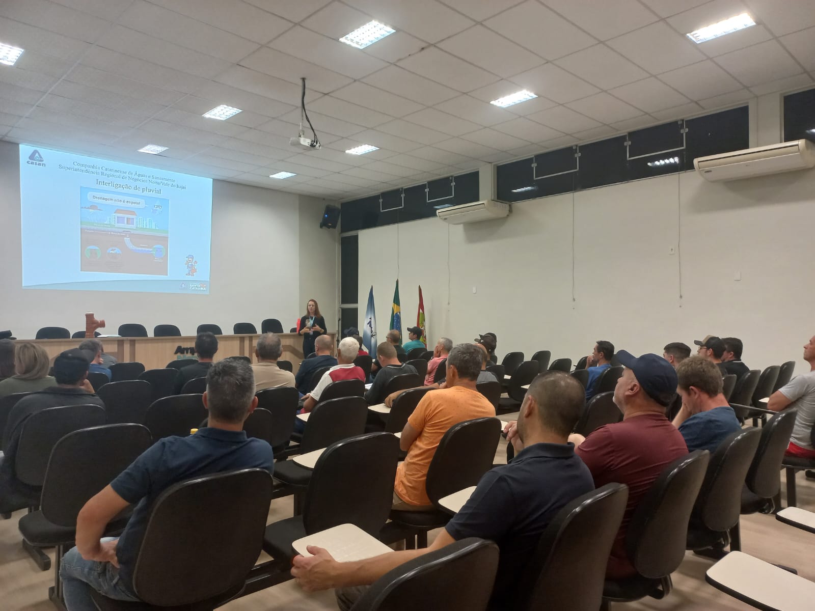 A CASAN promoveu nesta semana um curso gratuito sobre a ligação ao Sistema de Esgotamento Sanitário (SES) de Mafra. A capacitação, realizada na sede da Associação dos Municípios do Planalto Norte (Amplanorte), foi voltada para encanadores, pedreiros, profissionais da construção civil e instaladores hidráulicos. A chefe do Setor de Operação e Manutenção de Esgoto Sanitário da Superintendências Norte da CASAN, Priscila Carina Ribeiro Faedo, e o técnico em saneamento Brenno Mazaro dos Santos ministraram o curso.