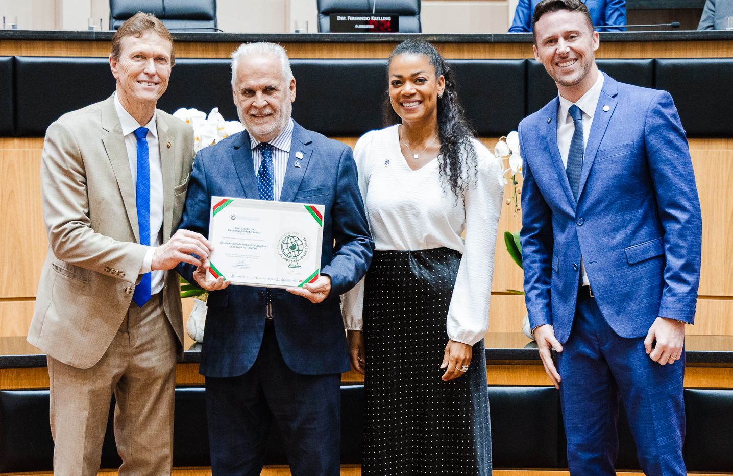 O certificado foi entregue na noite desta quarta-feira (10), no plenário Osni Regis da ALESC. O diretor- presidente Edson Moritz, a Coordenadora da Comissão Permanente de Sustentabilidade, Bianca Santos, e a Coordenadora do Grupo de Trabalho Social, Juliane da Costa Melo, representaram a Companhia.