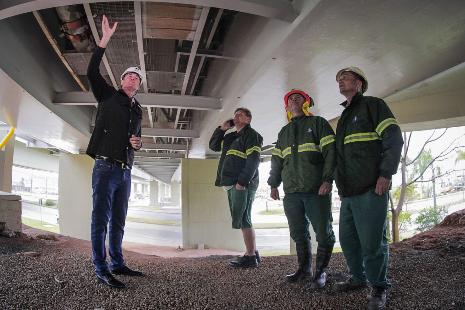 O diretor de operação e expansão Pedro Joel Horstmann fazendo a vistoria com técnicos na Ponte Pedro Ivo Campos. Foto: Allan Carvalho.