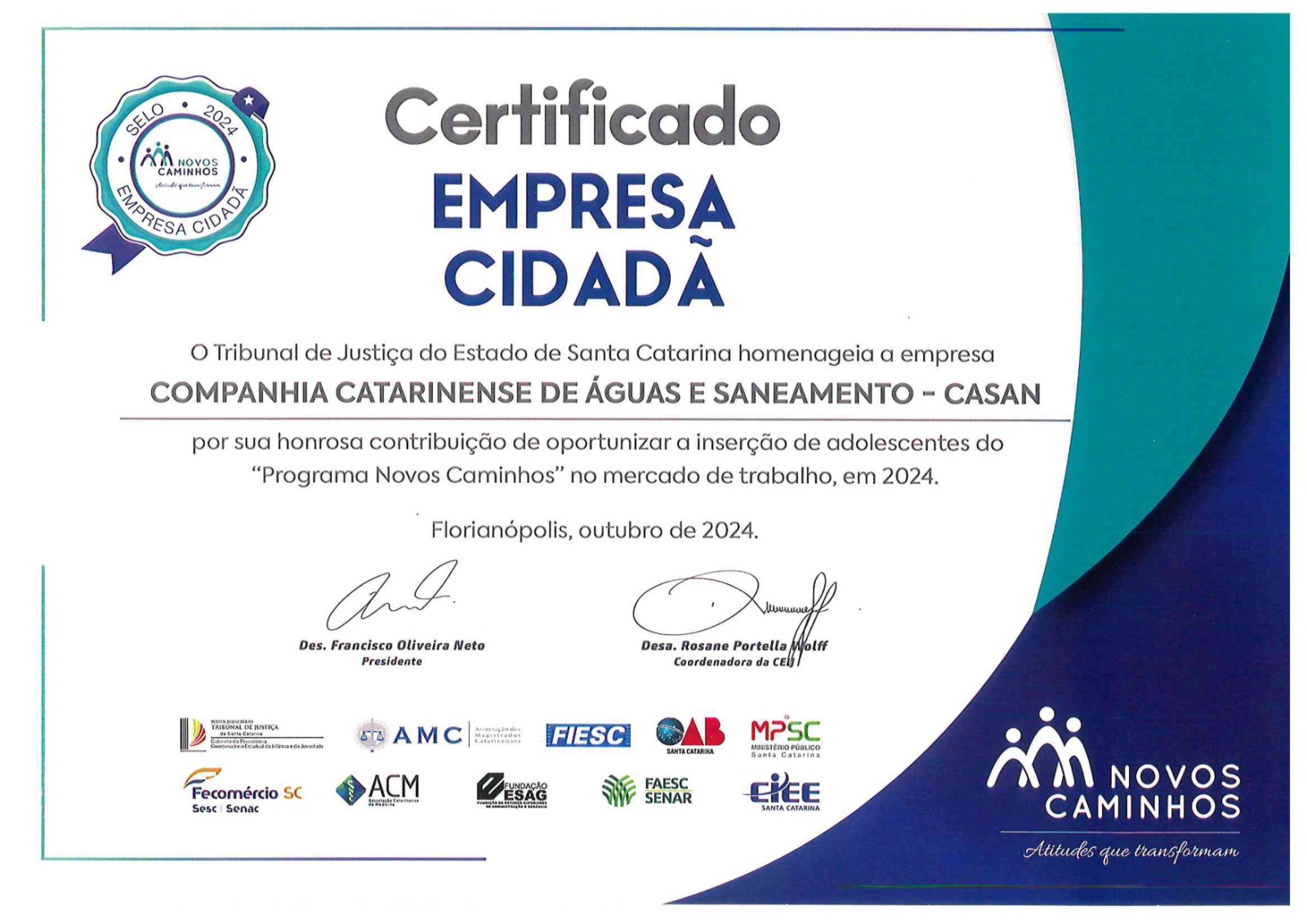 Com sua integração ao Programa Jovem Aprendiz, a CASAN mais uma vez está entre as instituições homenageadas e certificadas pelo Programa Novos Caminhos, voltado a transformar a realidade de crianças e adolescentes em ações de acolhimento em Santa Catarina. Atualmente a CASAN conta com 105 jovens aprendizes contratados em cidades de todo o Estado.