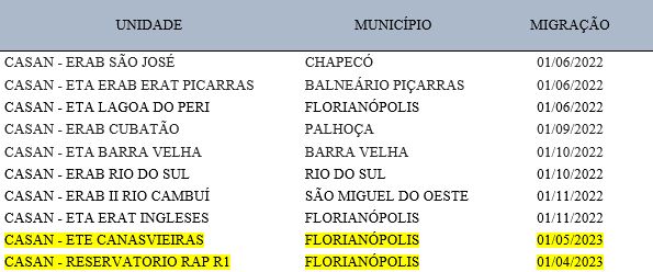 As estações de tratamento de água de Balneário Piçarras, a de Barra Velha e a da Lagoa do Peri, em Florianópolis, assim como a Estação de Recalque de Água Bruta de São José e a de Rio do Sul também já migraram para a nova modalidade de contratação.