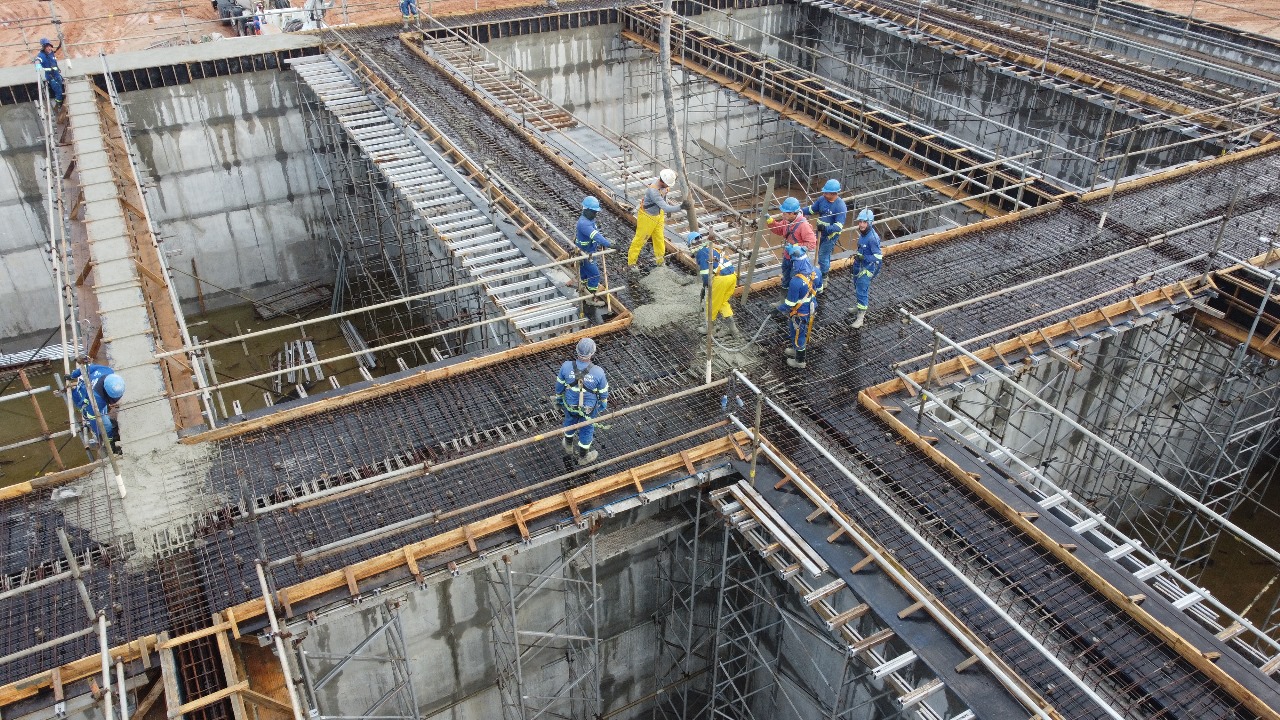 Cerca de 90 trabalhadores realizaram a concretagem das paredes internas do tanque de contato. A operação envolveu 12 caminhões betoneiras para depositar 107 metros cúbicos de concreto na estrutura.