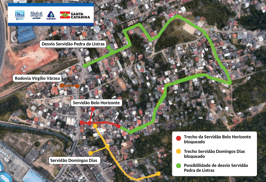 Devido à execução de escavações e movimentação de máquinas para apoio das obras, o acesso à Servidão Domingos Dias estará bloqueado durante o período das 7h às 18h. Já o acesso à Servidão Belo Horizonte, pela Rodovia Virgílio Várzea, ficará interditado a partir da próxima terça (26). Para os moradores da Servidão Belo Horizonte que estiverem acima da altura do n° 155, será possível fazer o desvio pela Servidão Pedra de Listras.