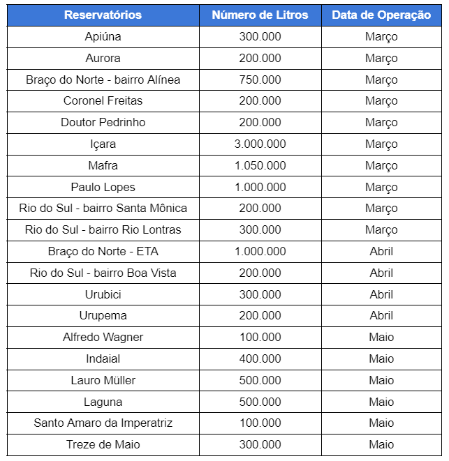 Os municípios que irão receber reservatórios novos interligados são Alfredo Wagner, Apiúna, Aurora, Braço do Norte, Coronel Freitas, Doutor Pedrinho, Içara, Indaial, Lauro Müller, Laguna, Mafra, Paulo Lopes, Rio do Sul, Santo Amaro da Imperatriz, Treze de Maio, Urubici e Urupema. Confira na tabela: