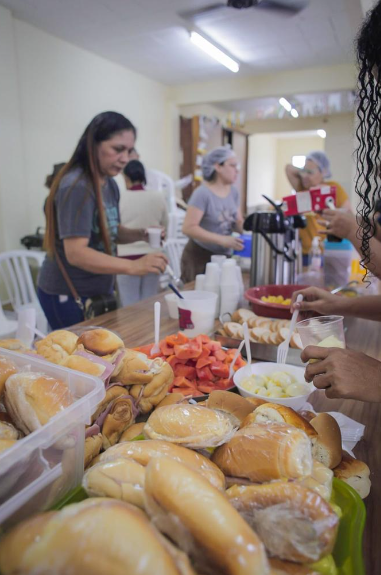 Em um mês de atividades de acolhimento, mais de 9 mil refeições foram servidas, incluindo Café da Manhã, Almoço, Lanche e Jantar. Inicialmente, a alimentação era fornecida no QG ao lado da Capela Rosa Mística, sendo depois transferida para um contêiner, instalado com tenda ao lado de uma área comunitária de lazer na rua José Luís Vieira.
