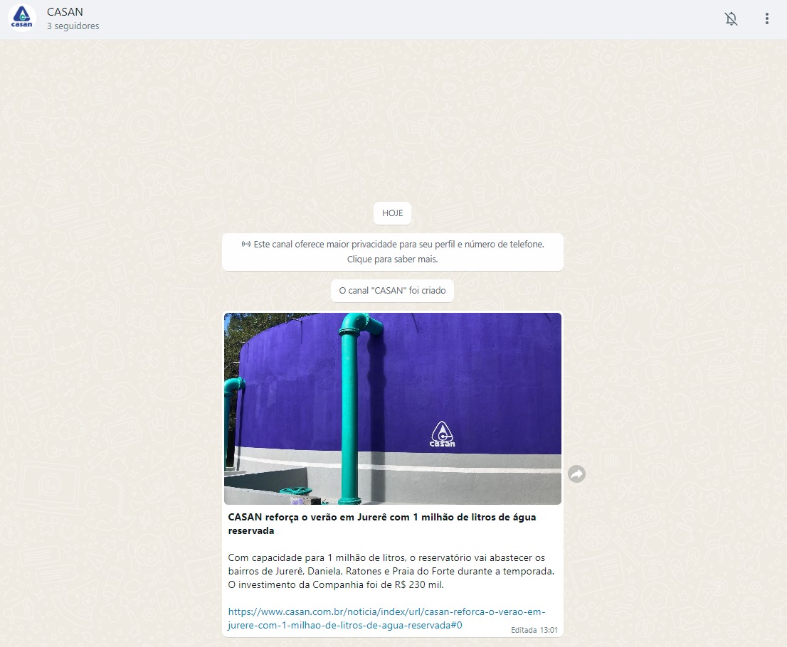 A CASAN (Companhia Catarinense de Águas e Saneamento) lançou o seu canal de divulgação de matérias pelo WhatsApp. Agora, interessados podem participar e receber em primeira mão as notícias sobre entregas de obras e serviços de água e esgoto em Santa Catarina.