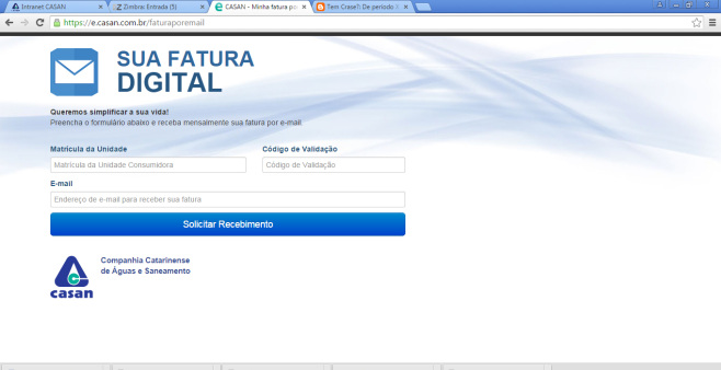 A partir do mês subsequente ao cadastro a fatura será entregue no local onde é prestado o serviço de água e esgoto, mas também será enviada para o e-mail cadastrado. A CASAN recomenda que para garantir o recebimento da fatura digital o usuário adicione o endereço de: remetente suafatura@casandigital.com.br à sua lista de contatos.