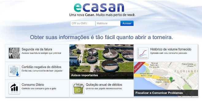 A Companhia Catarinense de Águas e Saneamento disponibiliza esta semana o ecasan, mais um canal de comunicação com seus clientes. O objetivo é facilitar o acesso a diferentes informações e serviços, em mais uma ação de modernização da gestão comercial. Segunda via da fatura, certidão negativa de débitos, pagamentos pendentes, histórico do volume fornecido e previsão do valor da conta de água estão entre as funcionalidades. O portal pode ser acessado no site www.casan.com.br e também em e.casan.com.br