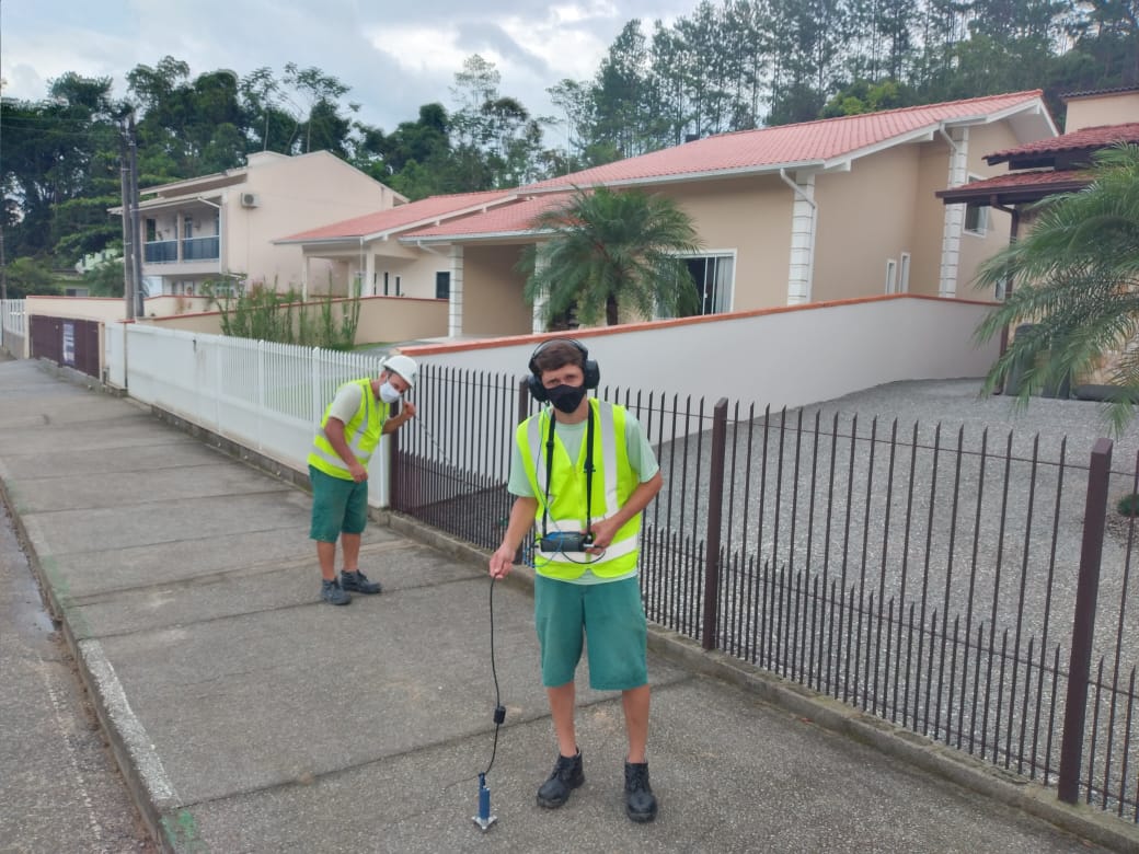 O problema foi identificado com auxílio de haste de escuta e geofone eletrônico, equipamentos usados na localização de vazamentos ocultos, que não afloram no terreno.