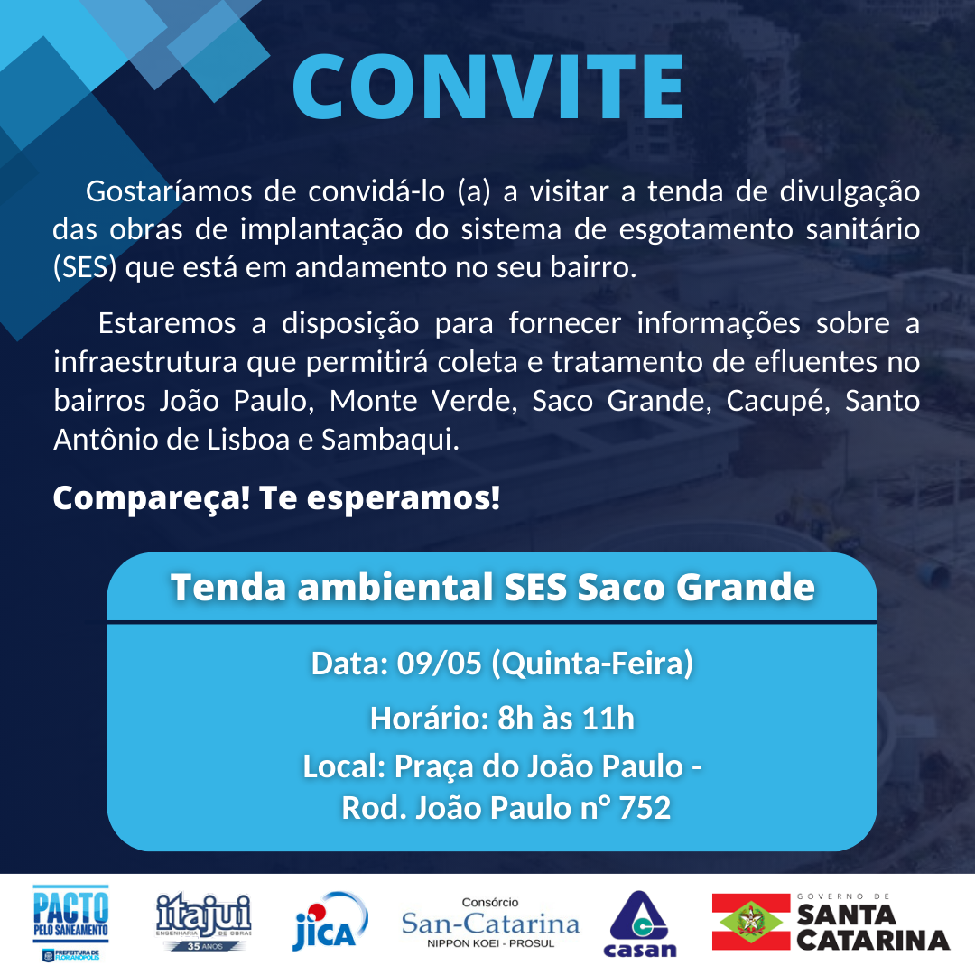 A partir da inauguração da Estação de Tratamento de Esgoto do João Paulo em julho, o novo Sistema de Esgotamento Sanitário Saco Grande vai gradualmente atender os moradores da Baía Norte, em Florianópolis. E para explicar os avanços que o tratamento de esgoto vai trazer em saúde, qualidade de vida e respeito ao meio ambiente, a CASAN (Companhia Catarinense de Águas e Saneamento) vai montar uma tenda informativa nesta quinta-feira (9). Ela vai acontecer na Praça do João Paulo, Rodovia João Paulo nº 752, das 8h às 11h.