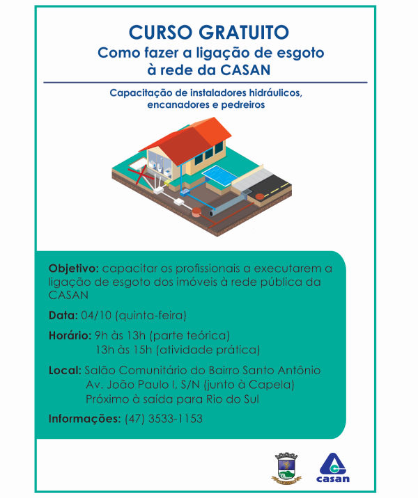 Será oferecido em Ituporanga nesta quinta-feira, dia 4, um curso gratuito direcionado a instaladores hidráulicos, encanadores e pedreiros. O objetivo é orientar como fazer a ligação das residências ao sistema público de esgotamento sanitário que está entrando em operação no município. Informações e inscrições por meio do telefone (47) 3533-1153.