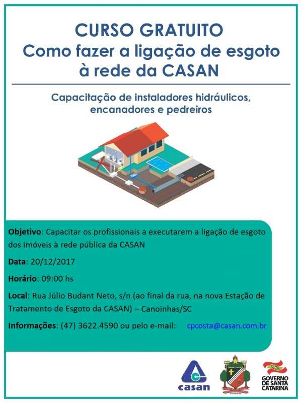 A CASAN oferece na próxima quarta-feira, dia 20, um curso gratuito para instaladores hidráulicos, encanadores e pedreiros de Canoinhas. O objetivo é orientar como fazer a ligação das residências ao sistema público de esgotamento sanitário que entrou em operação na cidade.