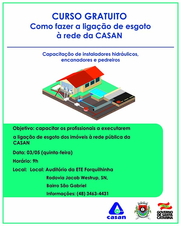 A CASAN vai oferecer no dia 3 de maio um curso gratuito direcionado a instaladores hidráulicos, encanadores e pedreiros de Forquilhinha. O objetivo é orientar como fazer a ligação das residências ao sistema público de esgotamento sanitário que está entrando em operação na cidade.
