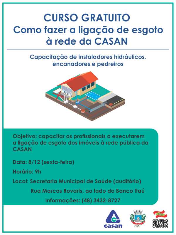 A CASAN oferece nesta sexta-feira, dia 8, um curso gratuito para instaladores hidráulicos, encanadores e pedreiros de Içara. O objetivo é orientar como fazer a ligação das residências ao sistema público de esgotamento sanitário que entrou em operação na cidade.