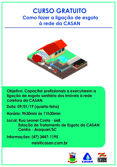 Estão abertas as inscrições para curso gratuito que a CASAN vai oferecer no dia 9 de janeiro na cidade de Araquari. O objetivo é capacitar profissionais a executarem a ligação de esgoto sanitário dos imóveis à rede coletora implantada pela Companhia.