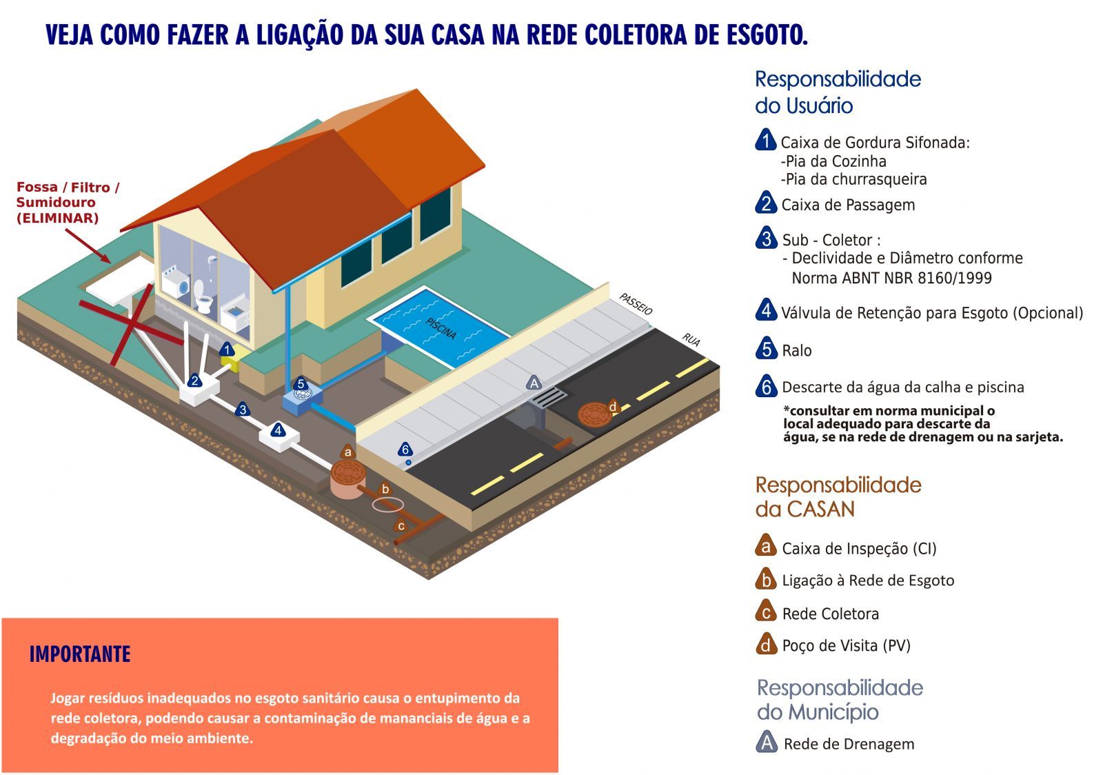 Para unidades que receberem os avisos nas faturas, a orientação é adaptar as instalações internas e conectar o esgoto domiciliar na espera (Caixa de Inspeção) implantada pela CASAN, em frente ou nos fundos do imóvel. As obras internas são responsabilidade do proprietário ou morador.