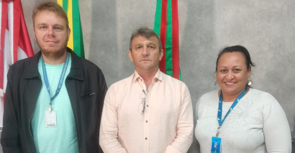 Prefeito Delir Cassaro recebe chefe da agência local da CASAN, Junior Felippe Preuss, e a assistente social Eliane Ferreira, que fará visitas à população