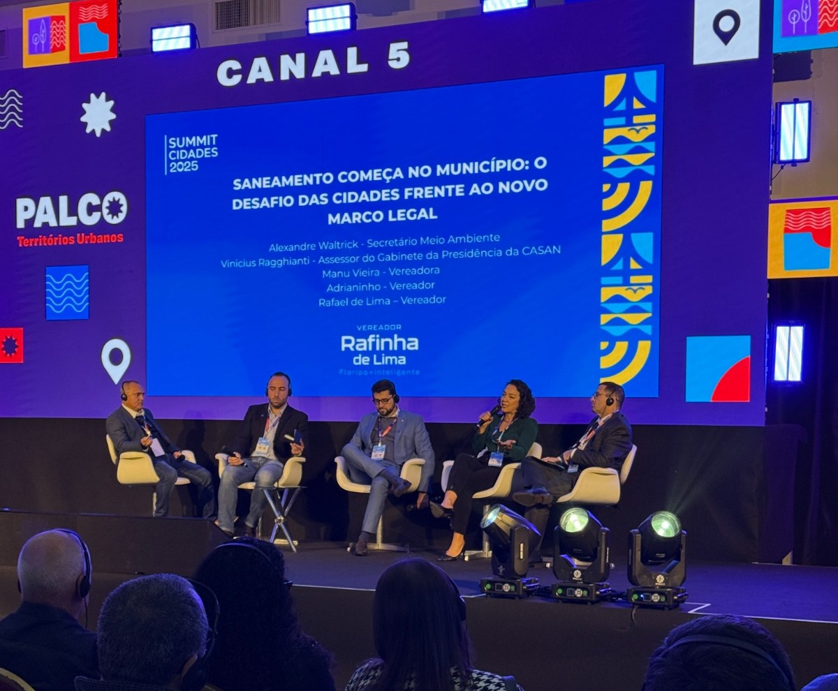Em mais um dia de atividades na 5ª Edição do Summit Cidades, a CASAN (Companhia Catarinense de Águas e Saneamento) debateu os desafios do saneamento municipal nesta quarta-feira (25). O assessor da Presidência, Vinicius Ragghianti, participou do painel “Saneamento Começa no Município: O Desafio das Cidades Frente ao Novo Marco Legal” junto com o secretário Municipal de Meio Ambiente de Florianópolis, Alexandre Waltrick, e os vereadores de Florianópolis, Adrianinho Flor, Manu Vieira e Rafael de Lima (Rafinha).