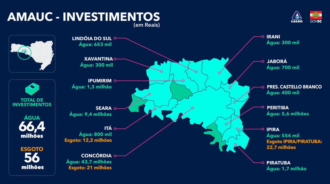 O governo do estado e a CASAN (Companhia Catarinense de Águas e Saneamento) anunciaram nesta manhã (1°) mais de R$122 milhões em investimentos para cidades integrantes da Associação dos Municípios do Alto Uruguai Catarinense (AMAUC). O anúncio foi durante o evento do Programa Santa Catarina Levada a Sério + Perto de Você realizado em Concórdia. A AMAUC é formada por 14 municípios, 12 deles atendidos pela Companhia.
