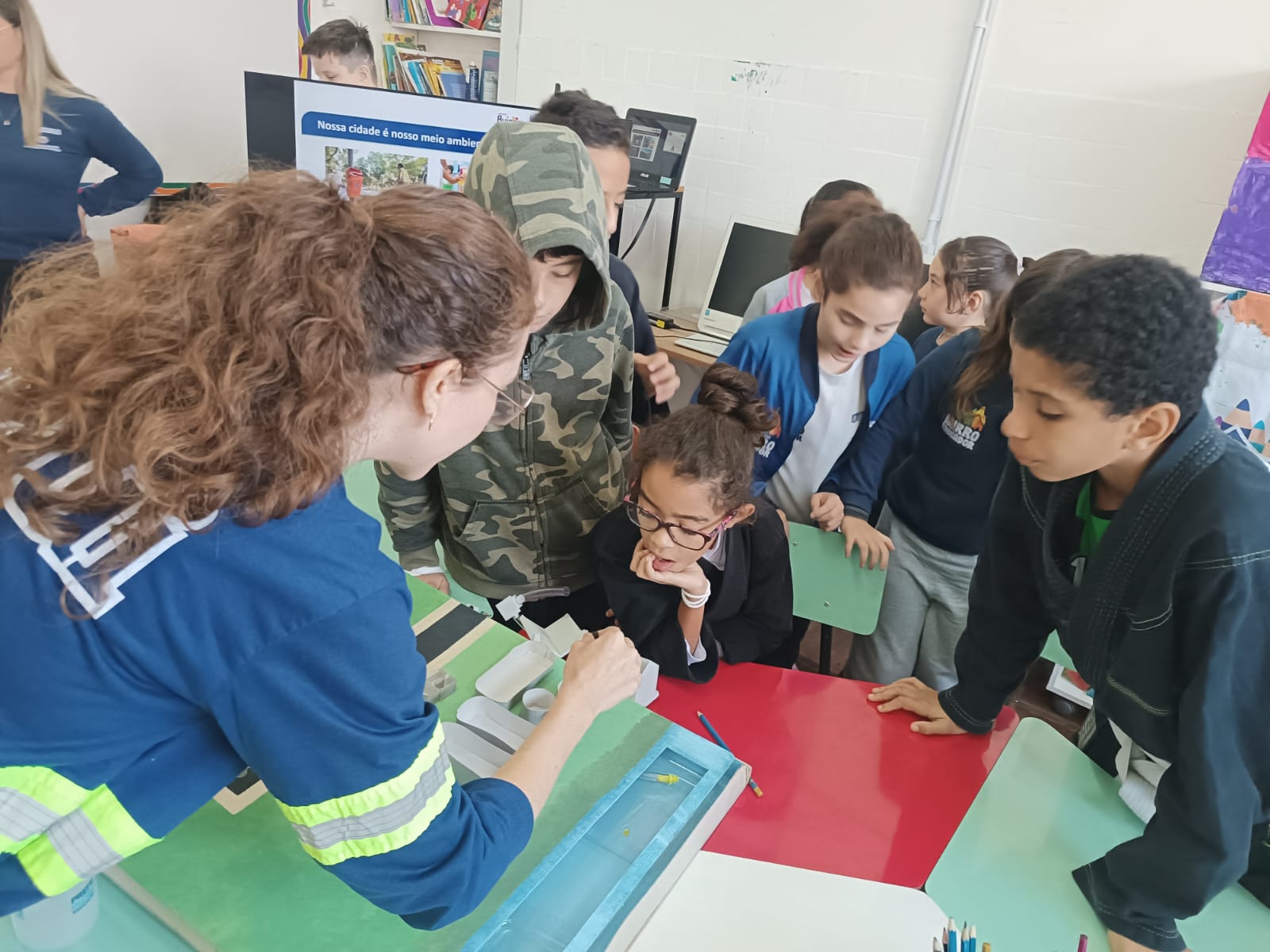 Os educadores ambientais ainda utilizaram uma maquete para mostrar o funcionamento de um sistema de esgotamento sanitário, desde a coleta de efluentes domésticos até sua depuração nas Estações de Tratamento de Esgoto (ETE). Depois de tratado, o efluente retorna à natureza sem causar danos ao ambiente ou riscos à saúde humana.