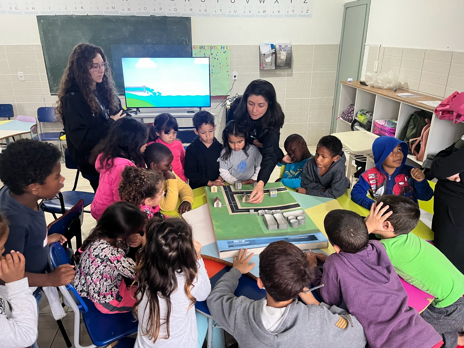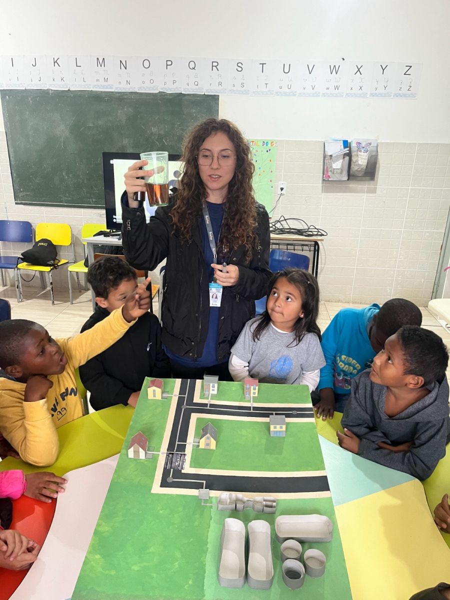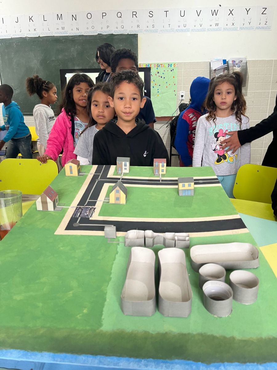 A oficina teve como objetivo ensinar de forma lúdica o funcionamento de um Sistema de Esgotamento Sanitário e de drenagem pluvial. A maquete de uma cidade foi utilizada para simular o caminho do efluente sanitário e do escoamento da água das chuvas. Enquanto a rede de drenagem escoa a água das chuvas diretamente para os rios e córregos para evitar o alagamento das ruas, as redes de coleta de esgoto direcionam o efluente doméstico para as Estações de Tratamento de Esgoto (ETE).