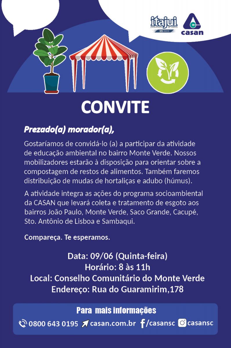 Em comemoração à Semana do Meio Ambiente, a CASAN vai realizar, nesta quinta-feira (9), uma atividade de educação ambiental com oficina de compostagem, distribuição de mudas de hortaliças e adubos de minhoca (húmus) para a população no bairro Monte Verde, em Florianópolis. A tenda ficará montada durante o período da manhã, das 08 às 11 horas, na sede do Conselho Comunitário.