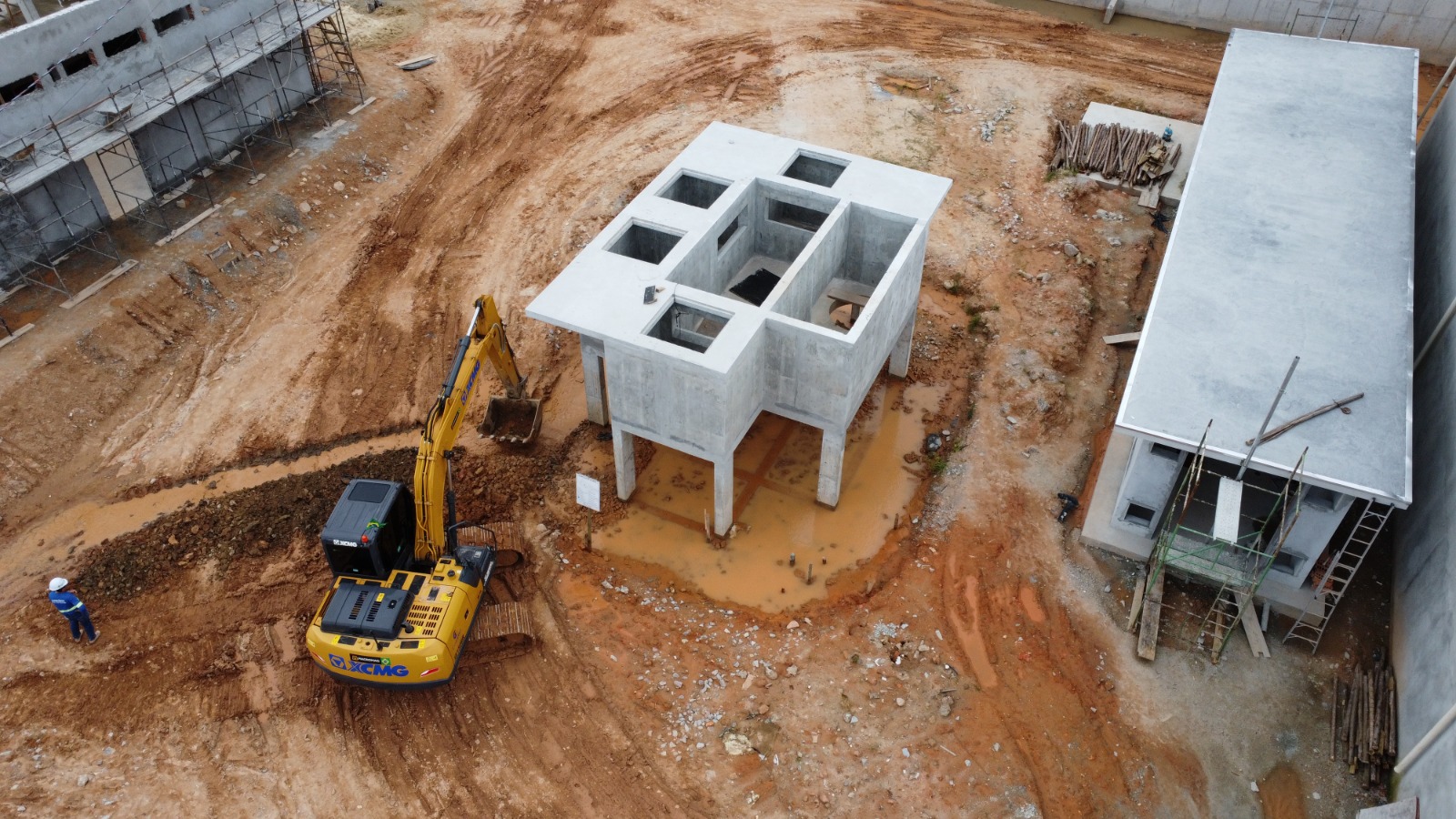 As operações de concretagem também prosseguem, finalizando as estruturas da nova ETE. Na última semana a equipe realizou a concretagem das passarelas e vigas superiores do tanque de aeração 4. Dez caminhões betoneiras depositaram cerca de 88 metros cúbicos de concreto nas estruturas.