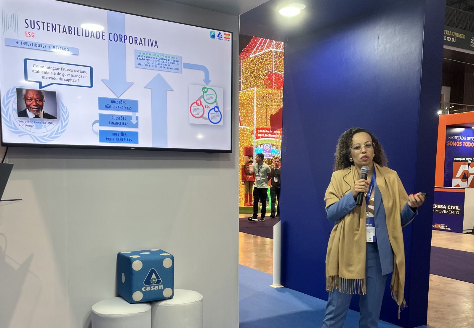 As palestras iniciaram pela manhã com a gerente de Captação de Recursos e Relações com Investidores, Bianca dos Santos Ribeiro de Oliveira, que apresentou o tema “Água, Futuro e Desenvolvimento Sustentável: como o ESG vem agregando valor à CASAN e como essa experiência pode fortalecer a sustentabilidade do seu município”.