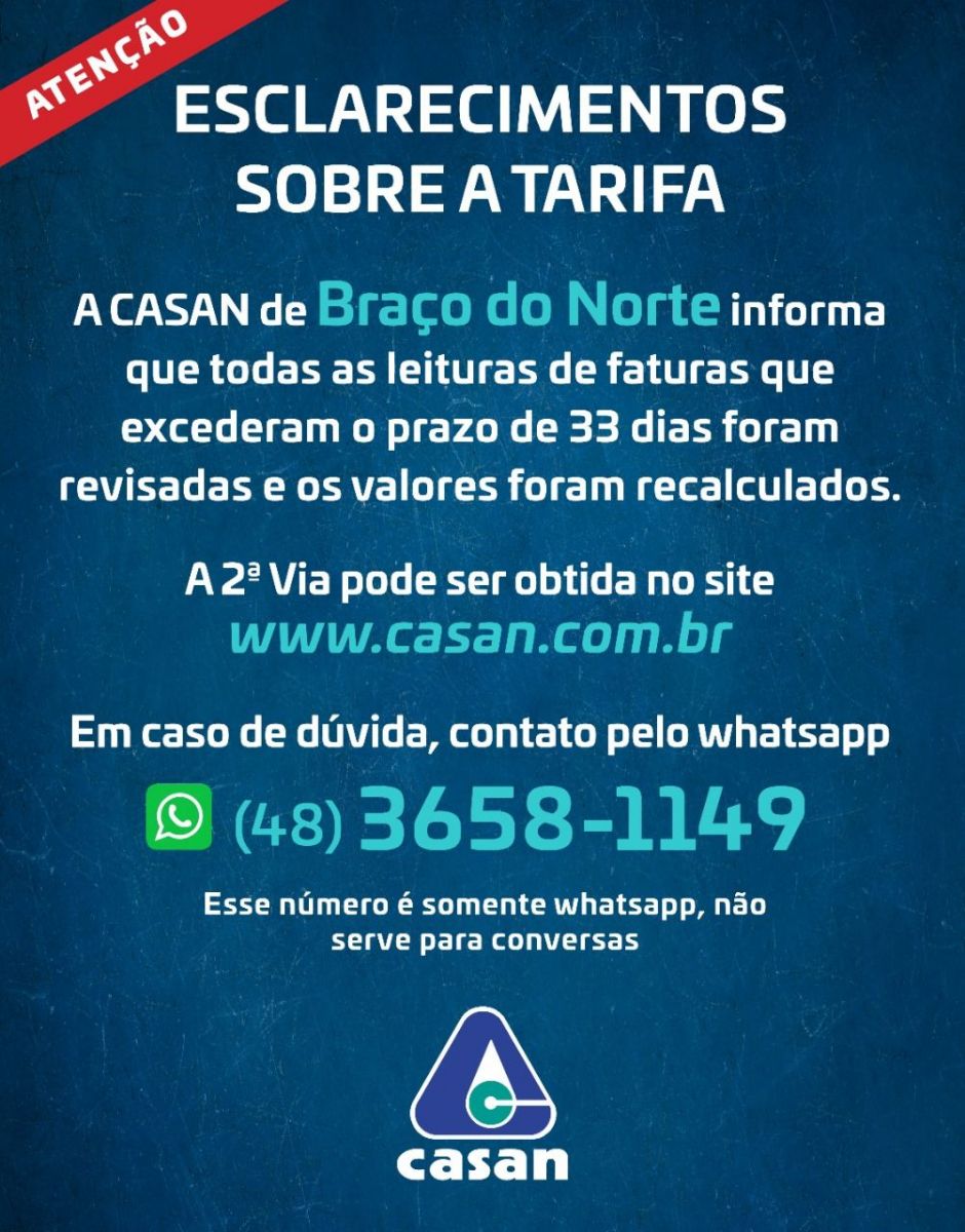 Reafirmando seu compromisso com a prestação dos serviços de saneamento, a CASAN reforça aos moradores que permanece à disposição para esclarecimento quanto às correções que foram necessárias nas tarifas de água e esgoto no município de Braço do Norte.