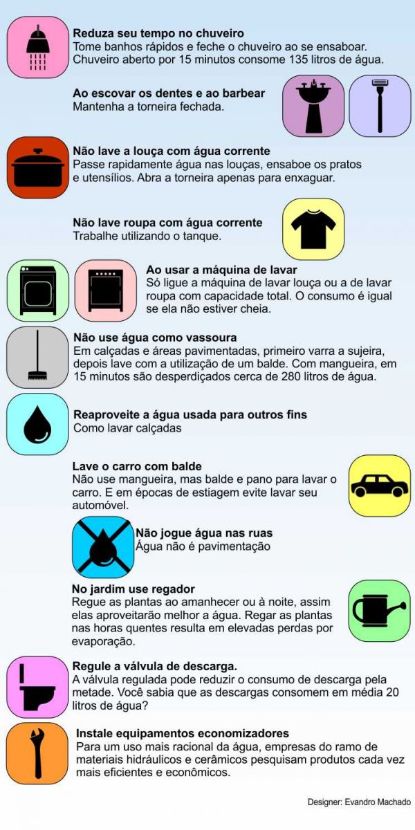 O técnico lembra também que aproximadamente 75% da água consumida numa residência é gasta nos banheiros. Por isso, uma dica importante é evitar banhos prolongados (estima-se o gasto de 10 litros de água a cada minuto sob o chuveiro) e utilizar descargas com caixa acoplada nos vasos sanitários, o que reduz o gasto de 20/30 litros para 6 a 12 litros por descarga.