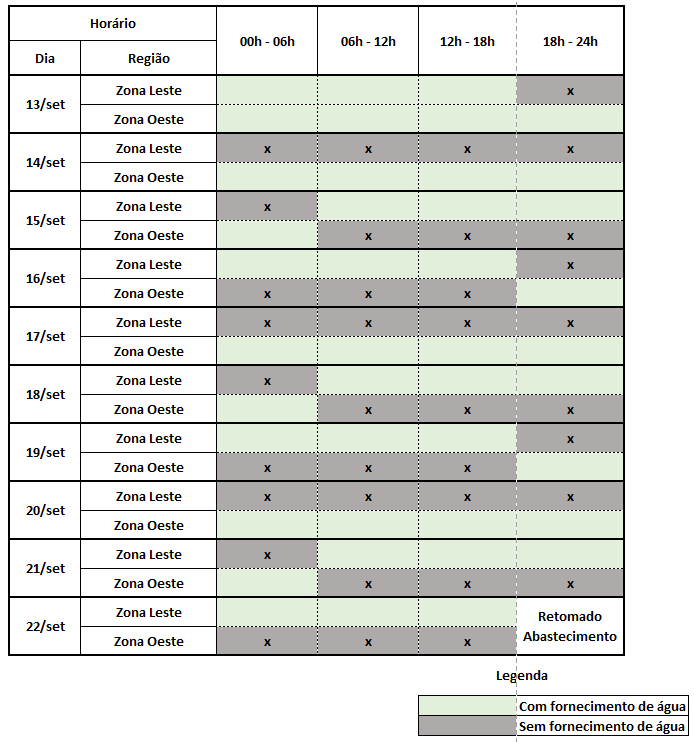 Confira abaixo com será organizado o abastecimento de 13 a 19 de setembro: