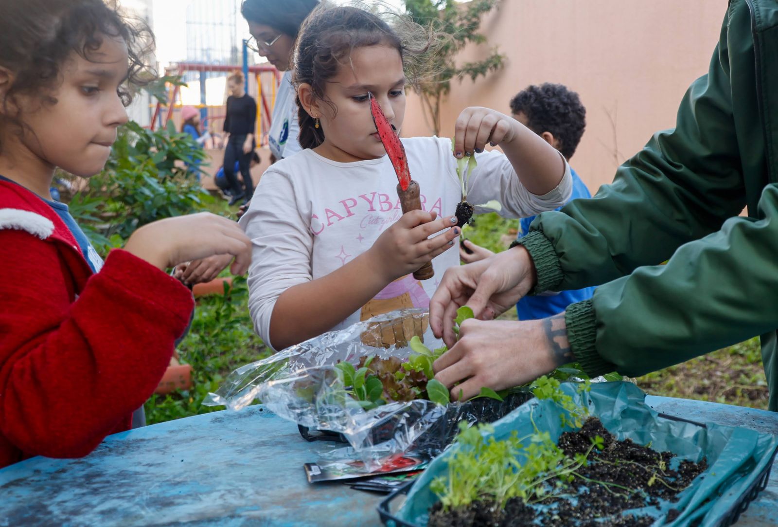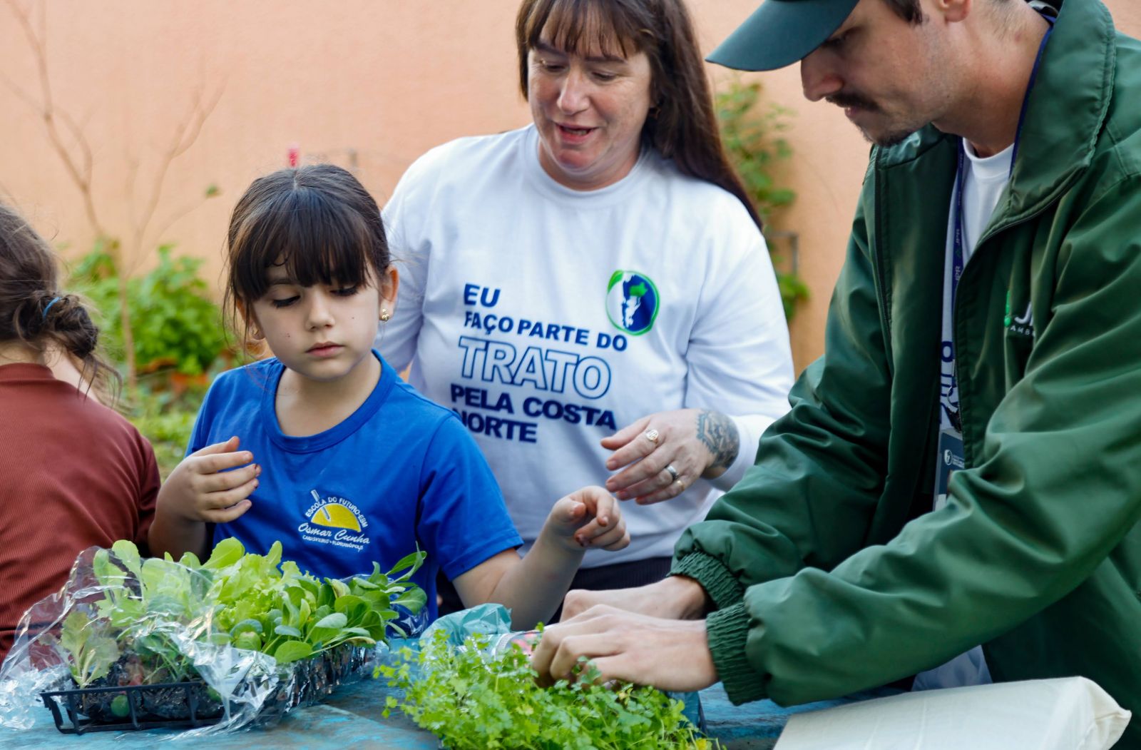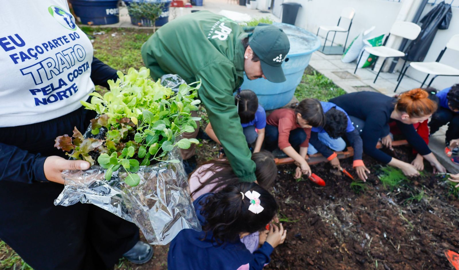 Foram entregues 170 mudas de hortaliças, em uma ação que aliou prática e sensibilização com o envolvimento de 60 crianças do 3º ano do Ensino Fundamental, de aproximadamente oito anos. Além de orientar o plantio, a equipe técnica do programa promoveu um diálogo sobre a importância do cultivo, do cuidado com o solo e da alimentação saudável. A atividade também foi uma oportunidade para apresentar o programa Trato pela Costa Norte, reforçando a relação entre saneamento, meio ambiente e qualidade de vida.