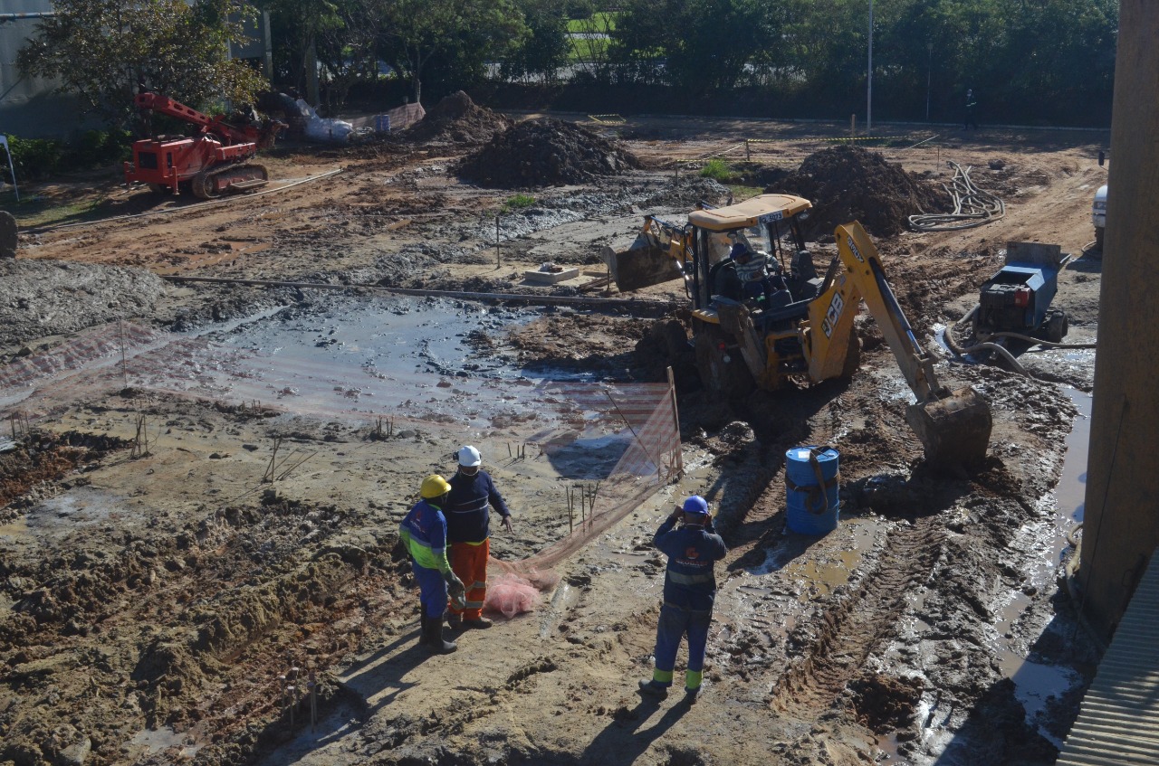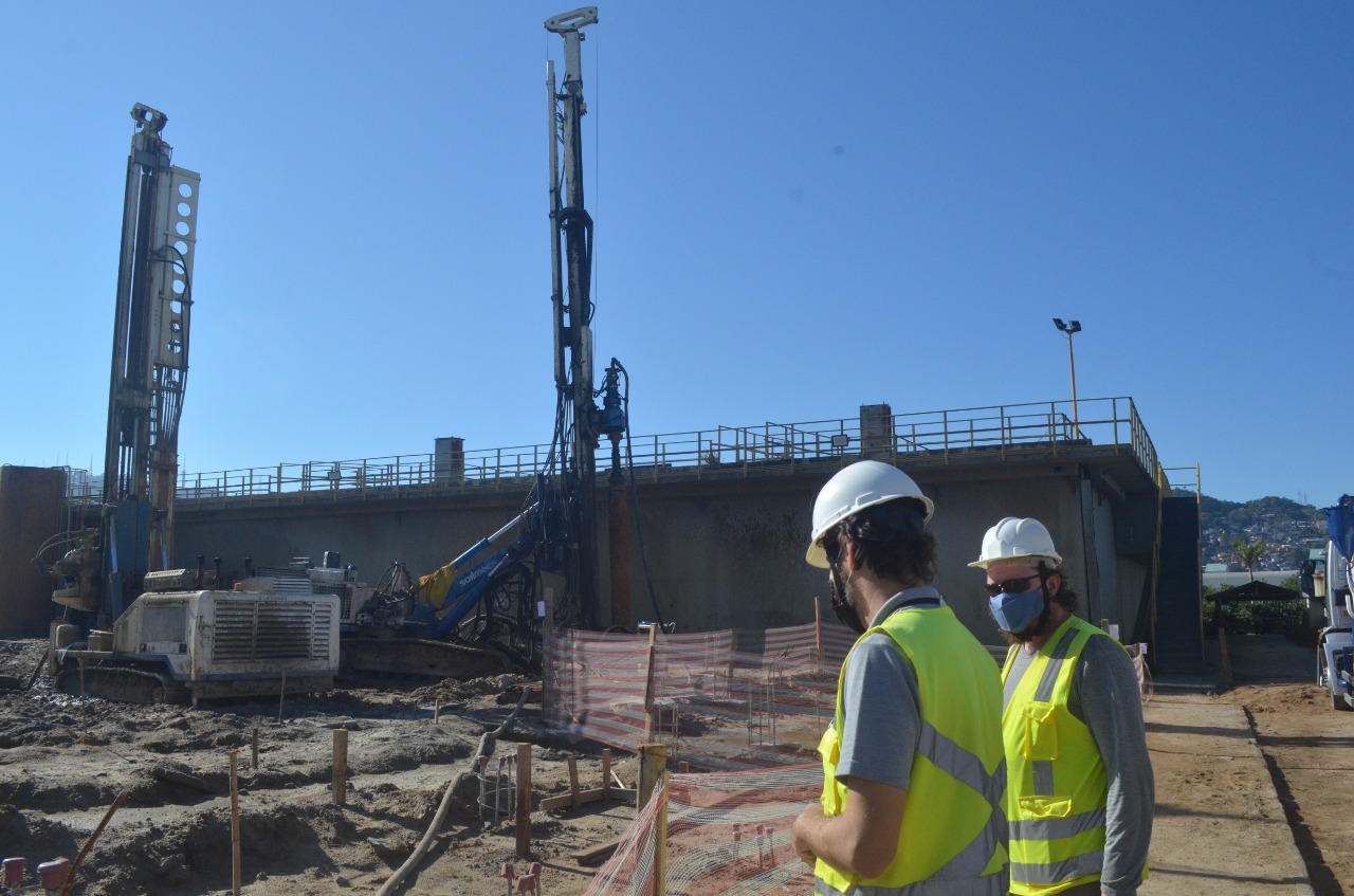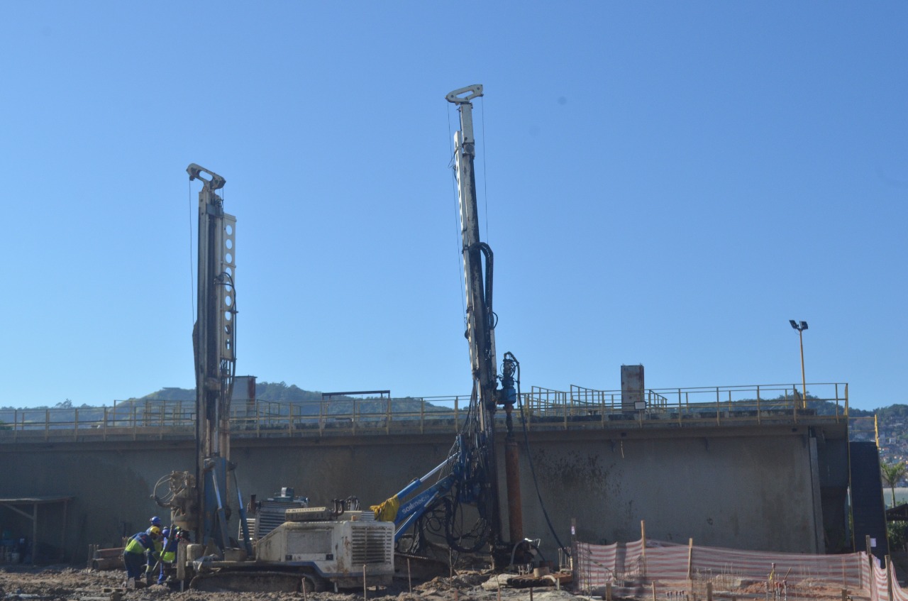 Continuam os trabalhos no canteiro de obras da ETE Insular. As obras seguem em fase de execução da fundação do Tanque de Aeração 3, unidade que possui maior número de estacas de todo o projeto, sendo mais de 19.600 m a serem cravados, dos 35.166 m totais previstos.
