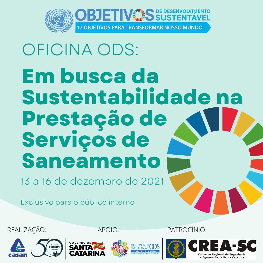 A nova Oficina, coordenada pela Universidade Corporativa da CASAN, vai traçar um plano de ação comprometido com a melhoria da qualidade de vida da sociedade catarinense e que impulsione, especialmente na área de saneamento, os compromissos da ONU para o Desenvolvimento Sustentável. O evento tem apoio financeiro do CREA-SC, por meio do Edital de Seleção Pública de Projetos para Patrocínio.