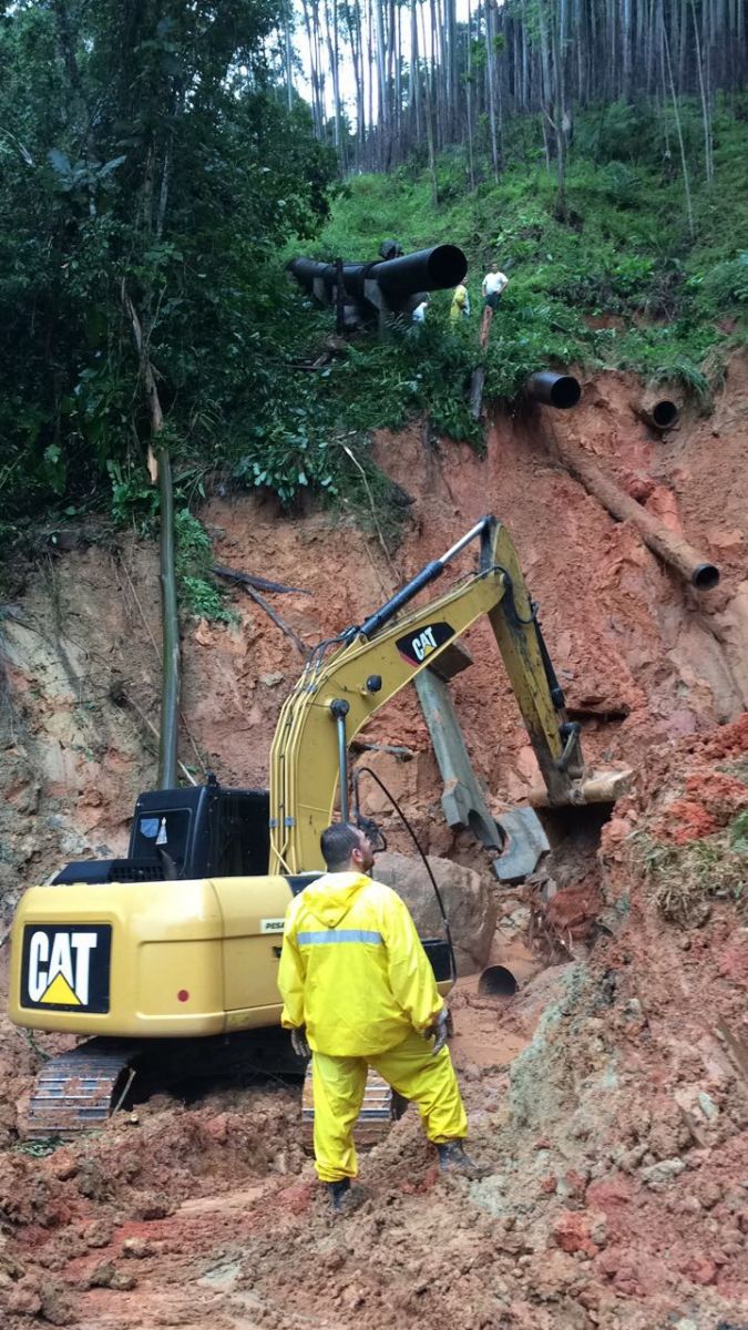 Desde que o domingo amanheceu, equipes da CASAN estão no local providenciando no conserto da tubulação rompida devido a deslizamentos de terra.