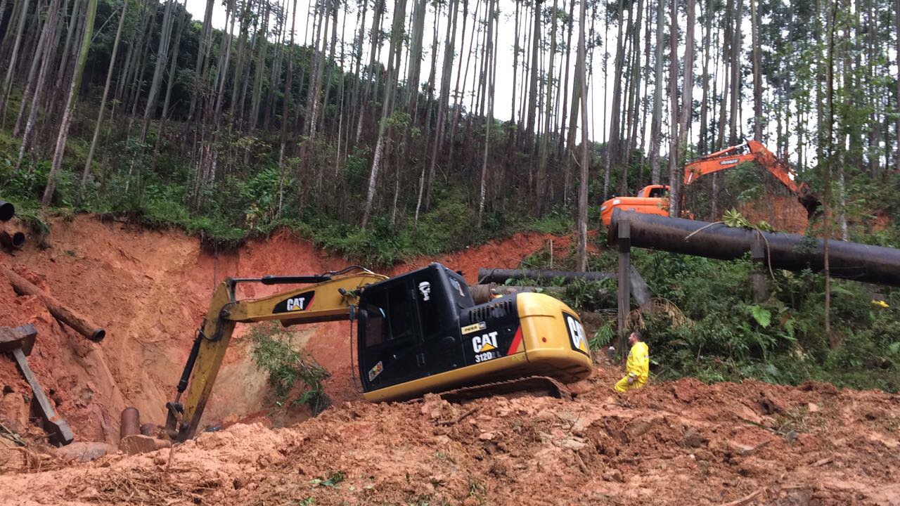 Equipes conseguiram levar maquinário até o local de difícil acesso e já trabalham no conserto das tubulações.