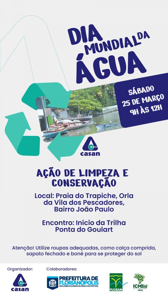 Florianópolis /Gerência de Meio Ambiente da CASAN Ação de Limpeza e Conservação Vila dos Pescadores / Bairro João Paulo, entre 9h e 12h, com saída no início da Trilha Ponta do Goulart. O objetivo é promover boas práticas ambientais relacionadas à conservação e preservação de recursos hídricos, sensibilizando a comunidade sobre a importância do saneamento para a região que está recebendo obras de esgoto para atender os bairros João Paulo, Monte Verde, Saco Grande, Cacupé, Santo Antônio de Lisboa e Sambaqui. |