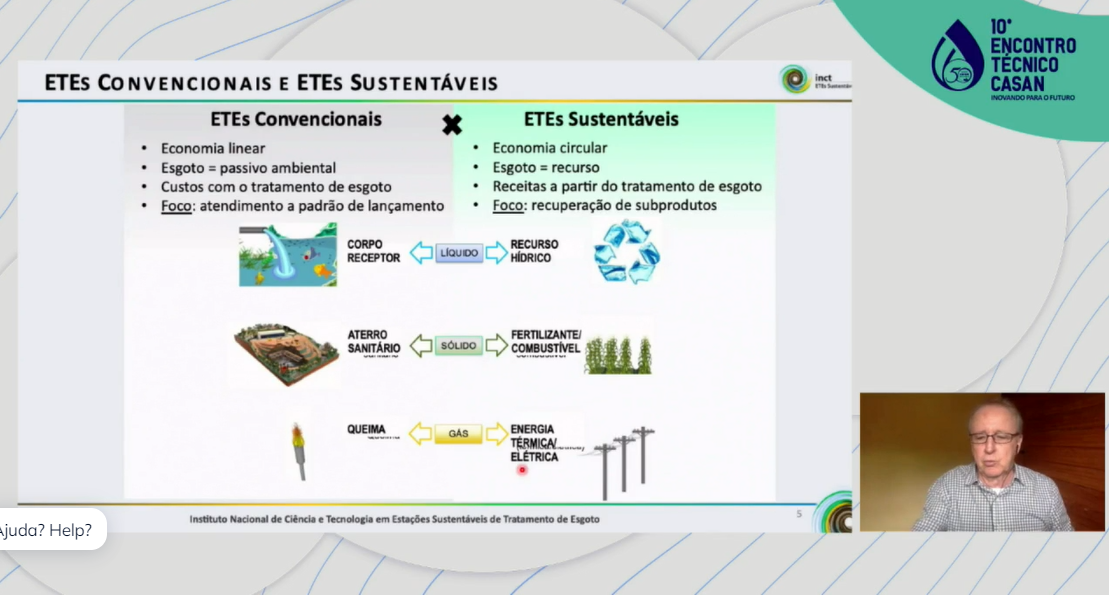 Em contrapartida, Chernicharo detalhou o funcionamento das ETEs sustentáveis. Enquanto a ETE convencional é baseada na economia linear, com o esgoto sendo considerado um passivo ambiental e um custo, com foco no atendimento ao padrão de lançamento; a ETE sustentável se baseia na economia circular, considerando o esgoto como recurso, obtendo receita a partir do tratamento, com foco na recuperação dos subprodutos.