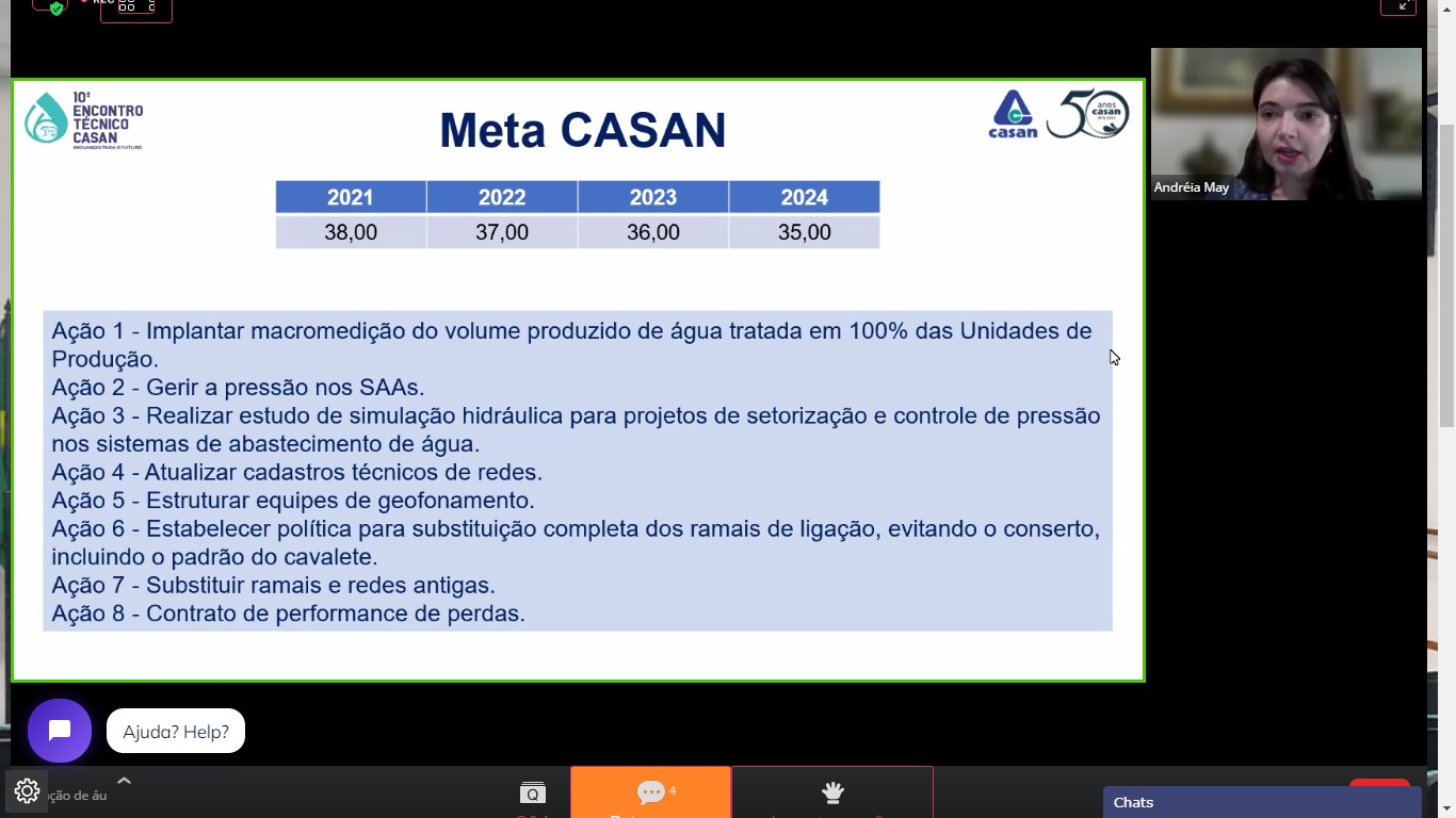 “Na CASAN trabalhamos com o desafio de diminuir esse índice de perdas, e chegar à meta de 35% no ano de 2024”, destacou Andréia. Atualmente a Companhia registra, em média, 39% de perdas totais (somatório entre perdas físicas e comerciais).