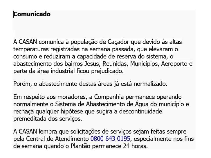 Em respeito à população de Caçador, a CASAN reafirma que continua operando normalmente o Sistema de Abastecimento de Água do município. Fiel aos princípios da empresa e ao histórico de responsabilidade na prestação de serviço público da estatal, a CASAN rechaça qualquer acusação que sugira a hipótese de descontinuidade premeditada dos serviços.