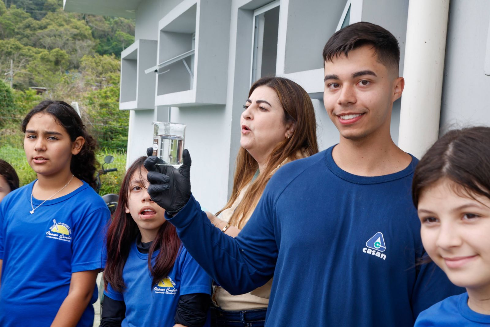 “É muito interessante poder conversar com os estudantes sobre nosso trabalho, que envolve desde a origem da água que chega às torneiras e o processo inverso: o que acontece com o esgoto após sair das residências, até seu retorno seguro ao meio ambiente”, explica Vitor Goulart Vieira, que atua no Setor de Operação e Manutenção de Esgoto da CASAN.