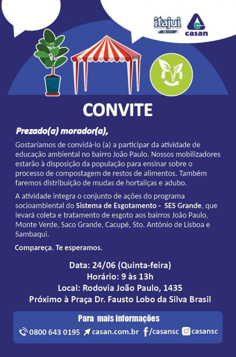 Nesta quinta-feira (24/06), mobilizadores socioambientais da CASAN estarão no bairro João Paulo, durante o período da manhã, realizando atividade de educação ambiental com oficina de compostagem e distribuição de mudas de hortaliças e adubos de minhoca (húmus) para a população.