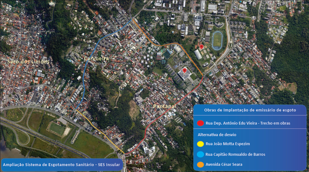 A via será parcialmente bloqueada no local da obra com o tráfego seguindo em meia-pista através do sistema siga e pare. Caso haja interesse dos condutores em desviarem do local, a rota indicada é pelo bairro da carvoeira através da Rua João Motta Espezim até a Rua Capitão Romualdo de Barros, seguindo pela César Seara, para o acesso à UFSC e Pantanal ou no sentido contrário para o acesso aos bairros Costeira e Saco dos Limões. Pedimos atenção dos motoristas para que estejam atentos à sinalização e aos limites da área de intervenção.