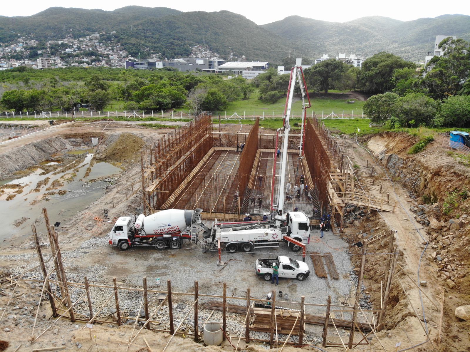 A nova Estação de Tratamento de Esgotos Saco Grande/João Paulo vai ganhando forma com o avanço das obras de ampliação. As frentes de trabalho iniciaram a concretagem das paredes do tanque de aeração 01, uma das maiores unidades da nova ETE, local onde é realizada a decomposição da matéria orgânica do efluente sanitário.