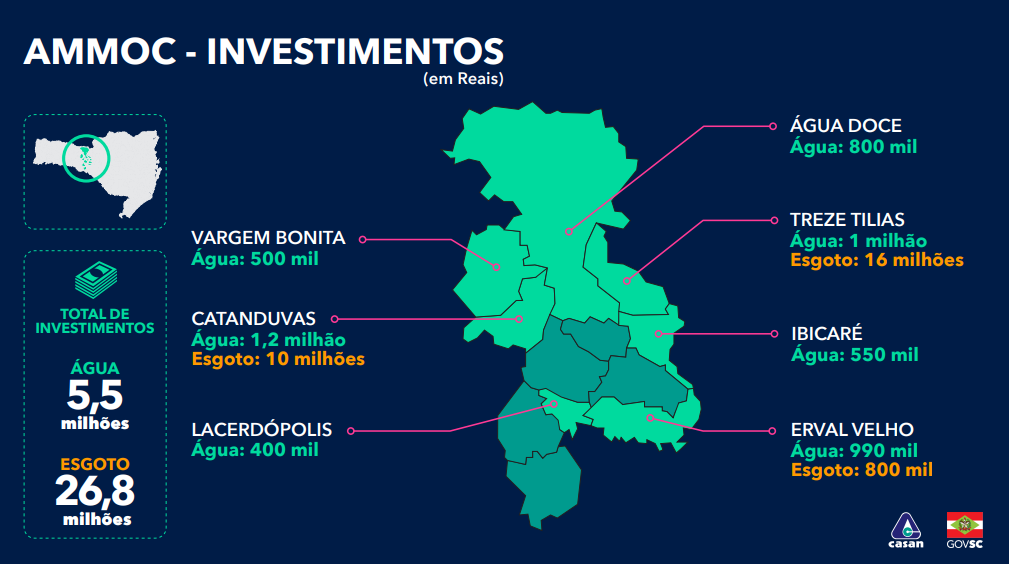 O plano de investimentos foi detalhado pelo diretor de Operação e Expansão da CASAN, Pedro Joel Horstmann. Estão previstos R$5,5 milhões para melhorias no abastecimento de água e R$26,8 milhões nos serviços de esgoto. Os maiores valores são destinados para os projetos de ampliação dos sistemas de esgotamento de Catanduvas (R$10 milhões) e de Treze Tílias (R$16 milhões).