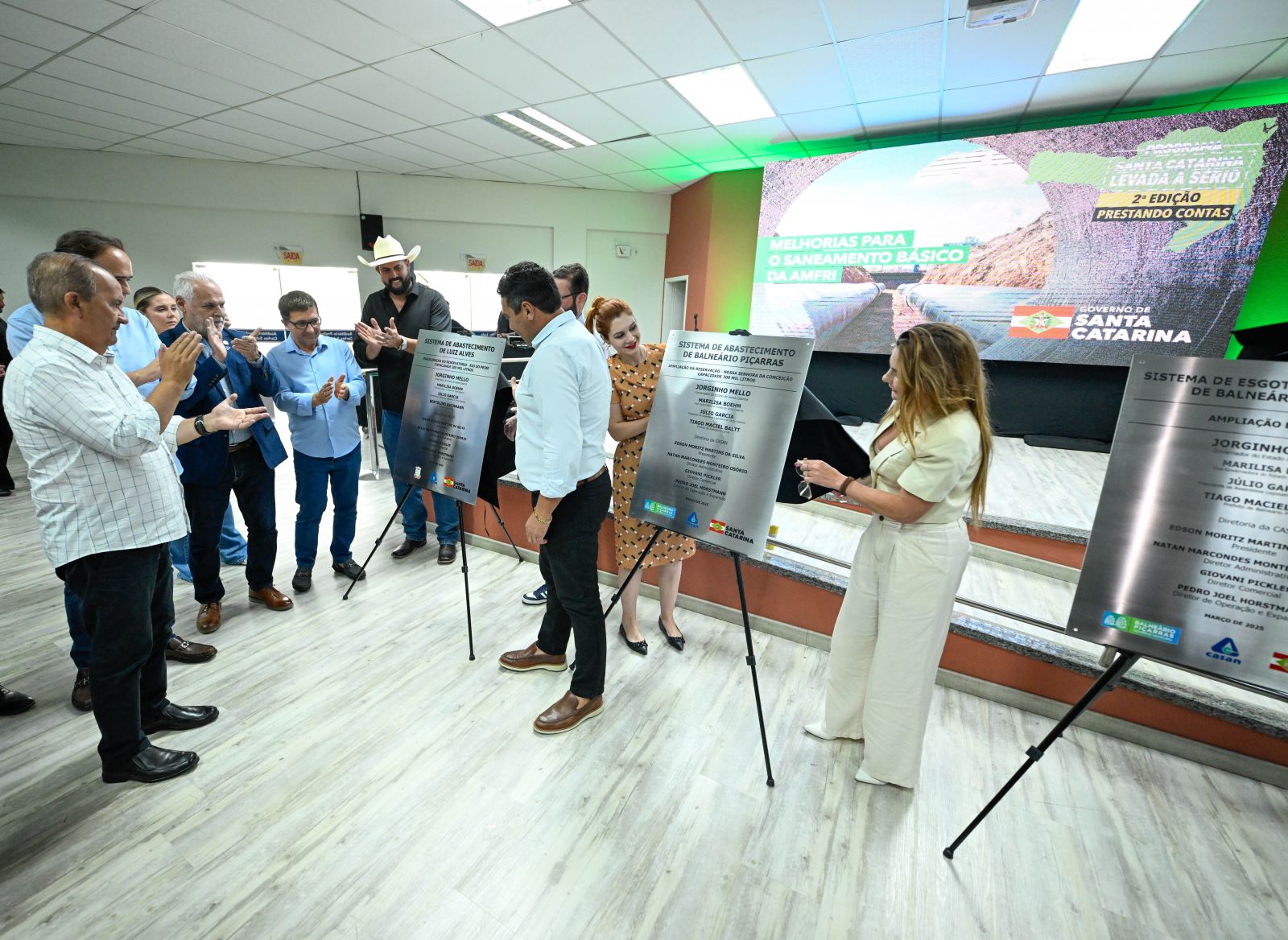 Em mais uma edição do Programa Santa Catarina Levada a Sério - Prestando Contas, que reuniu prefeitos da Associação dos Municípios da Região da Foz do Rio Itajaí (AMFRI) nesta quinta-feira (27), em Itajaí, o Governo do Estado e a CASAN (Companhia Catarinense de Águas e Saneamento) inauguraram obras para reforçar o saneamento.