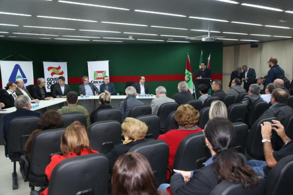 Em seguida, o governador participou de um ato com inúmeros anúncios para a saúde e a qualidade de vida de Criciúma e também de outros municípios da região. Entre eles, a assinatura da ordem de serviço para continuidade das obras do Sistema de Esgotamento Sanitário da Grande Prospera, com a implantação das estações elevatórias e o início da construção da estação de tratamento que vai atender essa localidade.
