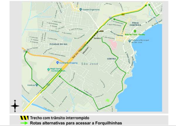 As obras de conclusão do terceiro trecho da Adutora 1.200 mm estão também exigindo modificações no trânsito. Desde terça-feira, dia 5, parte da via marginal da BR-101, no sentido Palhoça-São José (trecho entre a loja da Mitsubishi até o semáforo do trevo de Forquilhinhas) está fechado para o trânsito. Também a Rua Luiz Fagundes, em São José, está bloqueada para a passagem de veículos. Nos dois pontos está permitido apenas trânsito local. (veja mapa abaixo)