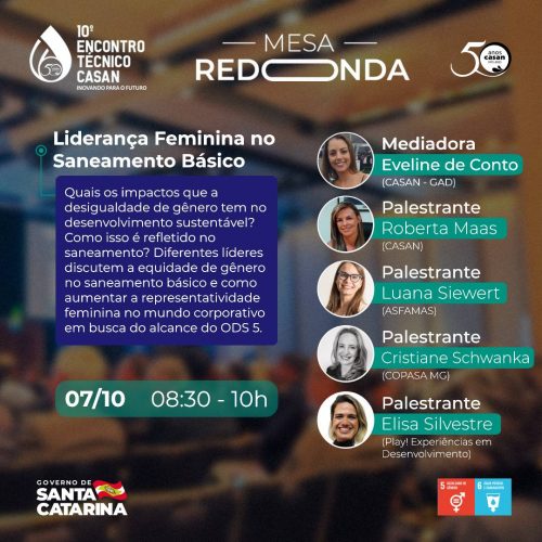 No dia no dia 7 de outubro, das 8h30min às 10h, a mesa-redonda “Liderança Feminina no Saneamento Básico” reunirá a diretora-presidente da CASAN, Roberta Mass dos Anjos; a diretora da ASFAMAS (Associação Brasileira dos Fabricantes de Materiais para Saneamento), Luana Siewert Pretto; a diretora de Relacionamento e Mercado da Companhia de Saneamento de Minas Gerais (COPASA – MG), Cristiane Schwanka; e a especialista em Hábitos de Alta Performance, Elisa Silvestre. A mediação será da gerente administrativa da CASAN, Eveline de Conto.